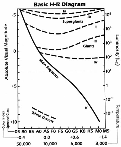 Astronomers classify stars by measuring several things and then plotting these mesurements in a diagram like the one below. This helps them learn more about those stars.